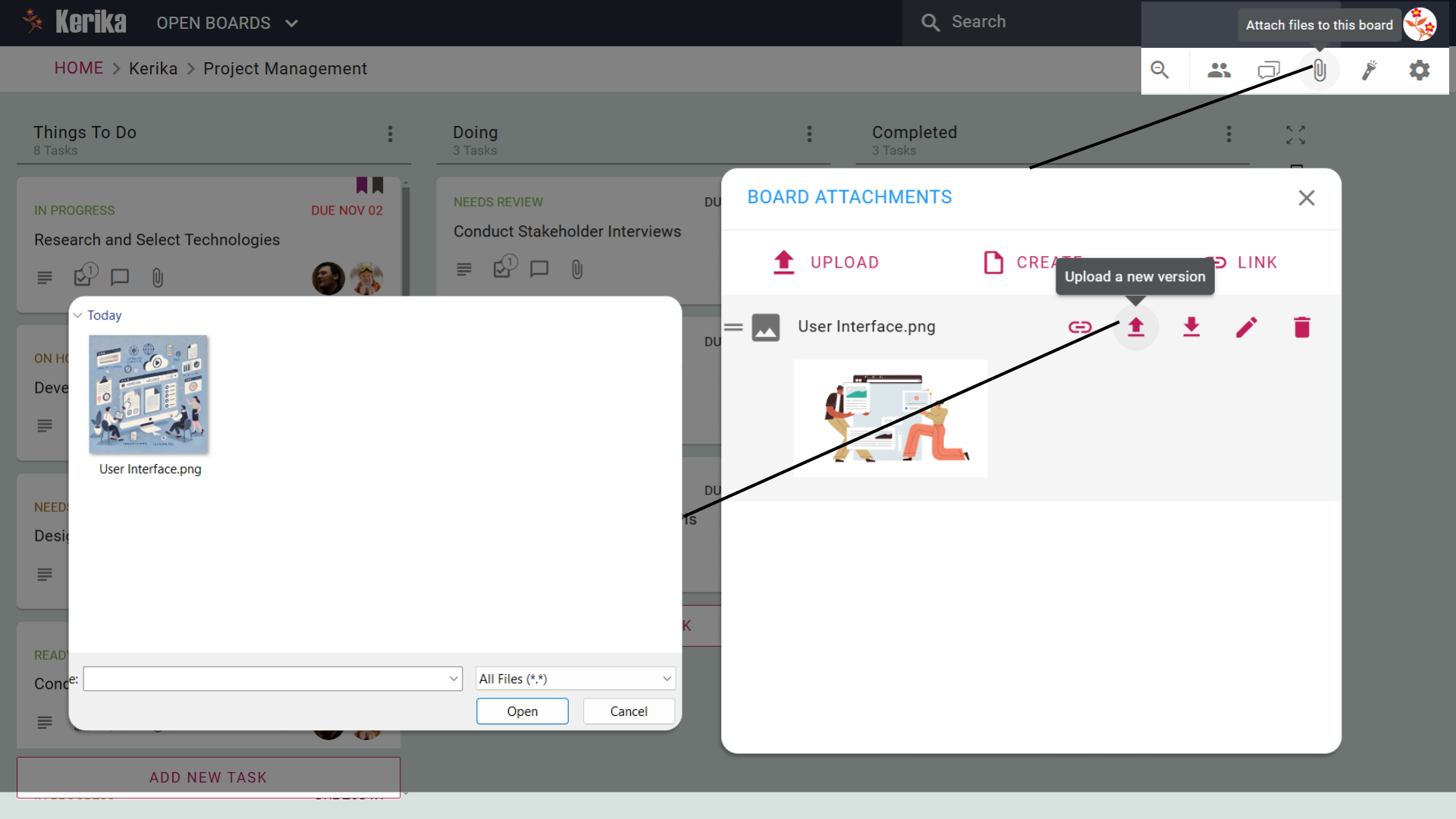In Kerika, files and attachments can be stored in two main areas: Task Cards and Board Attachments. Each area serves a unique purpose, giving you flexibility and control over your project files.