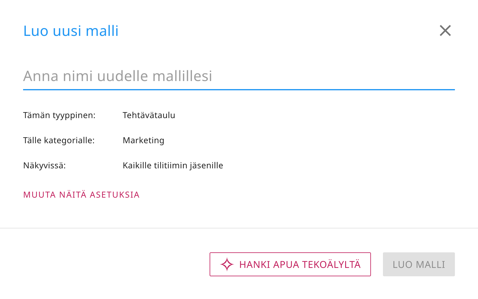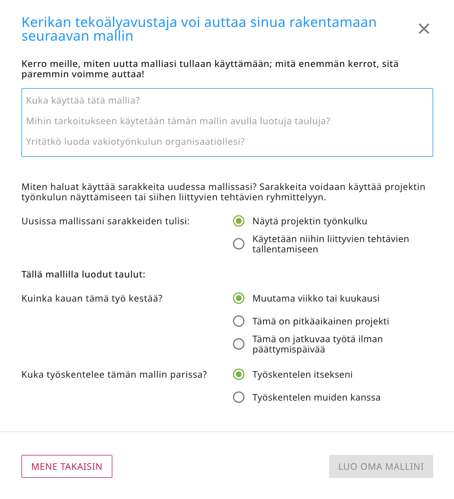 Mallien kohdalla pyydämme hieman yksityiskohtaisempia tietoja, ja kuten tekoälyn käyttämisessä uusien taulujen luomiseen, Kerikan tekoälylle antamiesi ohjeiden määrä ja laatu vaikuttavat suuresti siihen, miten hyvin tekoäly pystyy auttamaan sinua uuden mallin luomisessa.