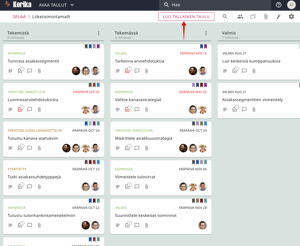 Onko Kerikassa joitakin erityisiä ominaisuuksia, joita haluaisit kokeilla, kuten eräpäiviä, tehtävätehtäviä, tiedostojen liitetiedostoja, kommentteja/keskusteluja?