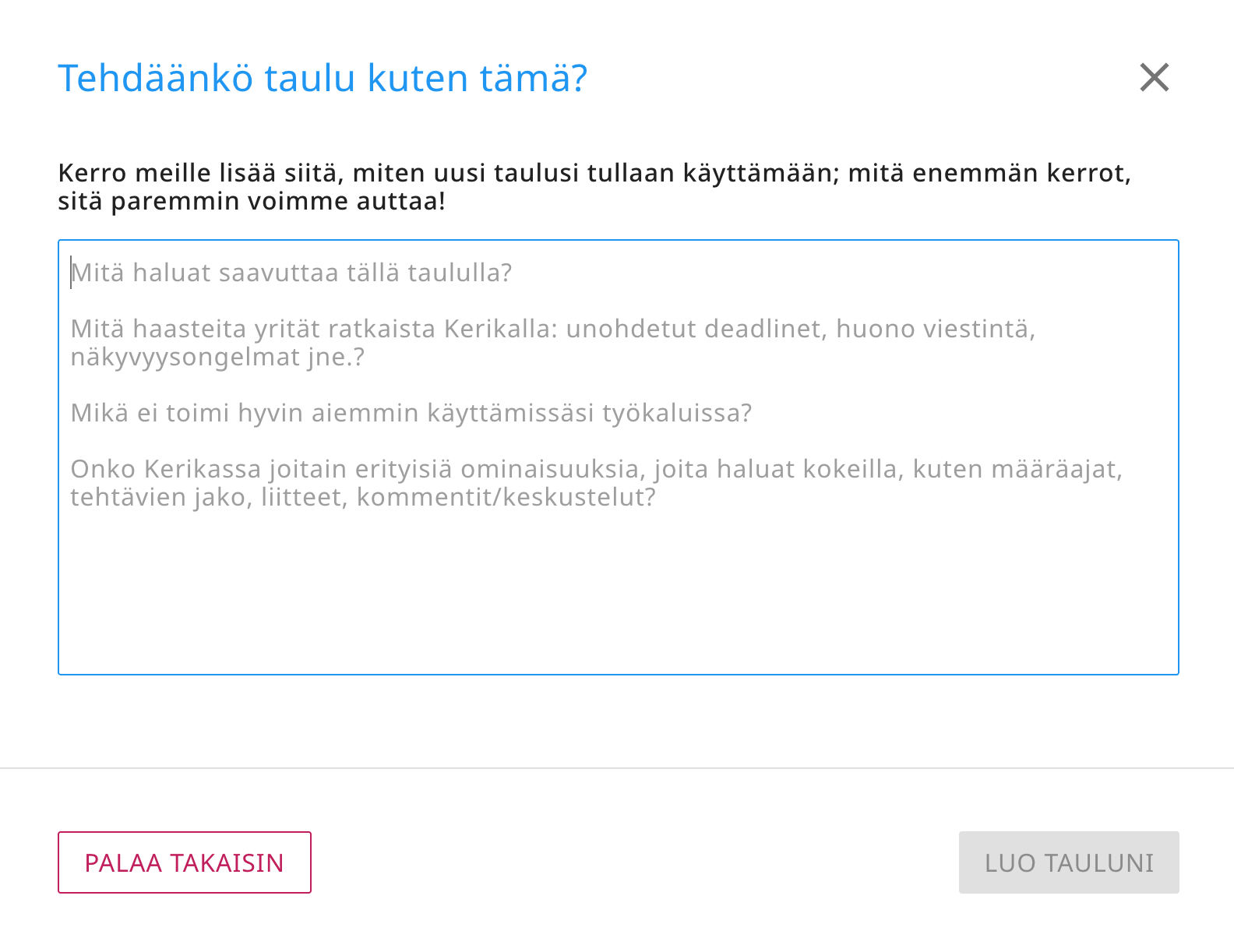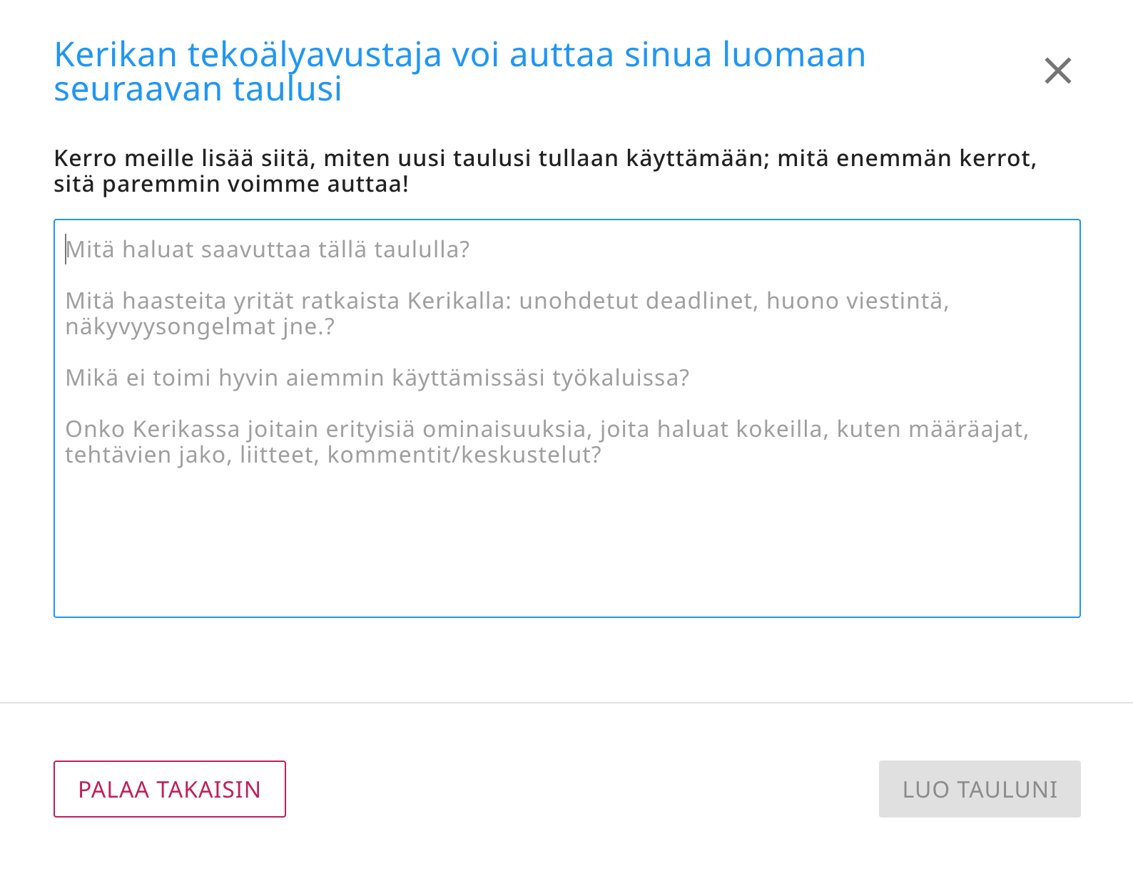 On erittäin tärkeää antaa mahdollisimman yksityiskohtaisia tietoja! Mitä enemmän kerrot Kerikan tekoälylle siitä, mitä haluat taulun tekevän, sitä paremmin se voi auttaa. Joitakin ehdotuksia siitä, mitä sinun tulisi kertoa tekoälylle: