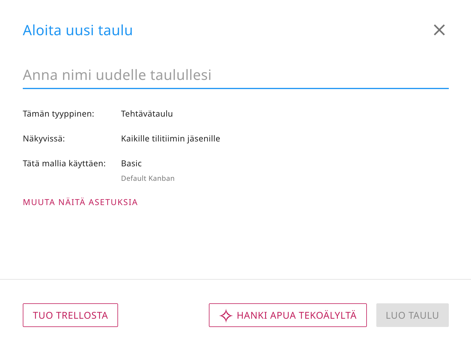 Kun haluat aloittaa uuden Kerika-tehtävätaulun, näet uuden vaihtoehdon GET HELP FROM AI: