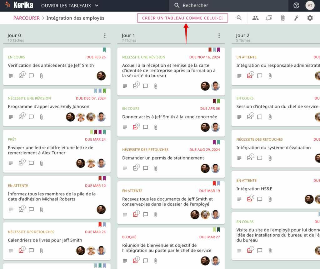 Ce dernier point est réservé aux nouveaux utilisateurs : lorsque les personnes s’inscrivent à Kerika, elles ont la possibilité de consulter nos nombreux exemples de tableaux (qui sont organisés par fonction) afin de se faire une idée de ce que Kerika peut faire avant de commencer leur premier tableau.