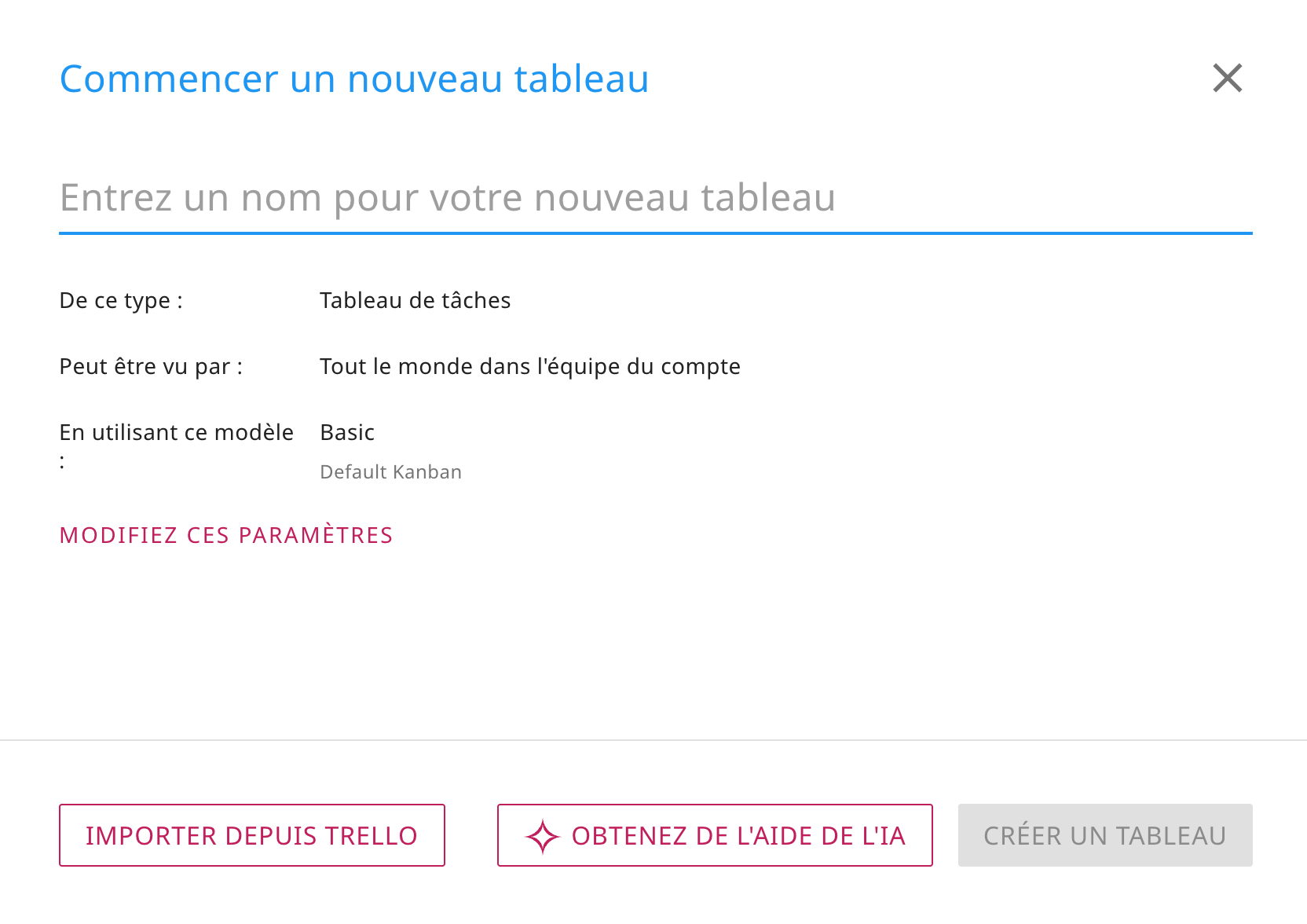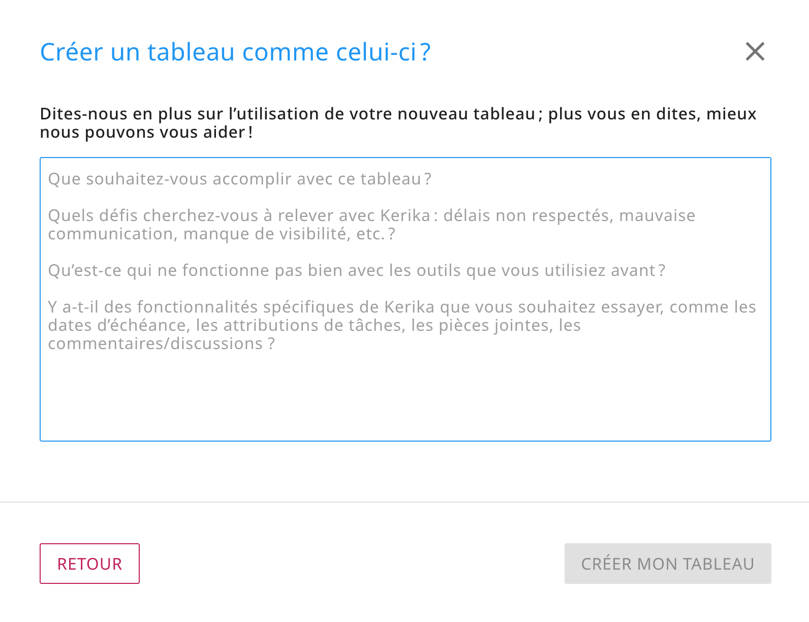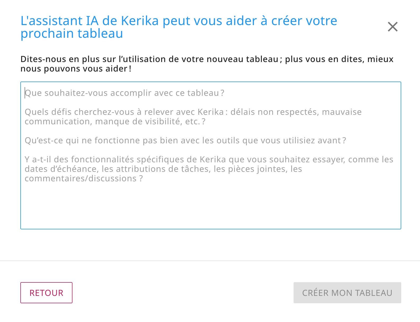 Lorsque vous voulez commencer un nouveau tableau des tâches Kerika, vous verrez qu’il y a une nouvelle option pour obtenir de l’aide de l’IA :